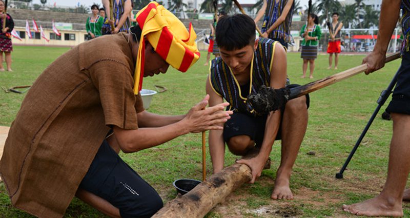 展示活动现场,2014级12 各体育班,367名员工身着黎族传统服饰,在黎族音乐伴奏下,有序展示12项黎族优秀文化元素。黎族旗帜、大鼓、铜锣、篝火、织锦、舂米、狩猎、钻木取火、祭火等表演仿佛将人们带入真实的黎族村寨,而黎族歌手用黎语演唱《大家都好吗》《织锦赞美歌》《赶鸟歌》等歌曲,烘托出浓郁的黎族风情。