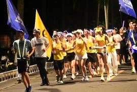 19时,荧光夜跑正式启动。首先,学子们伴随现场动感的音乐,卸下一天的学习疲惫跟随领操人一起做欢快的热身动作。其次,跑团团长李振锴介绍了荧光跑准备工作,指导老师冯蕾宣讲了活动注意事项,邱锡光副董事长寄语所有同学在荧光夜跑中尽情享受运动带来的快乐。再次,邱锡光副董事长、洪家云经理和跑团指导老师江亨南、吴强、冯蕾一起鸣枪启动起跑仪式。学子们挥动各色荧光棒从第一田径场操场出发,路线途经旅院广场、图书馆、东坡湖、行政楼等校内“打卡点”。