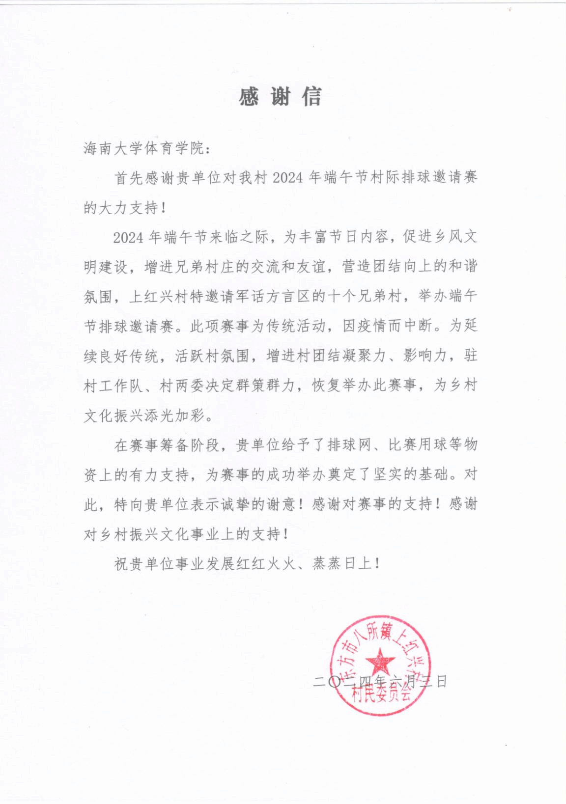 上红新村在感谢信中特别强调了对伟德的感激之情,感谢伟德对乡村文化振兴的有力支持。伟德的这一举措,不仅丰富了乡村的文化生活,更激发了村民们对体育运动的热爱和参与热情,为乡村文化建设注入了新的活力。