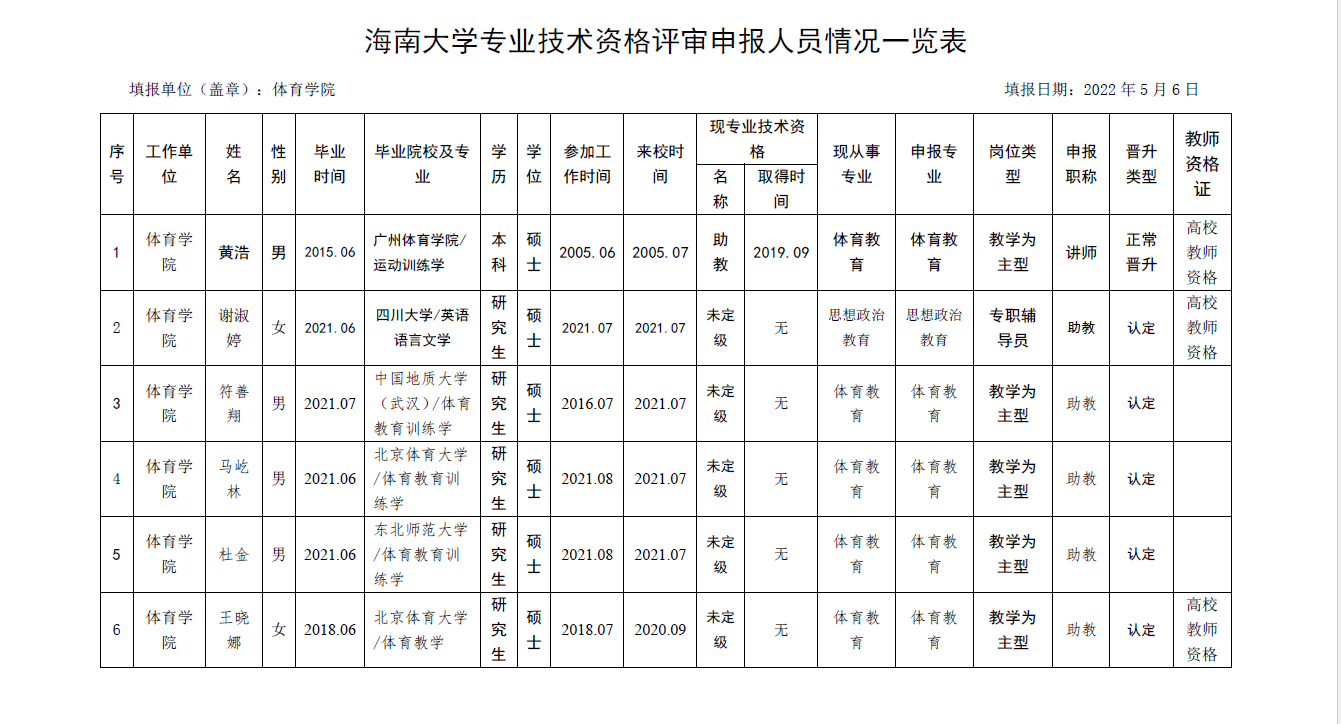 根据《海南省人力资源和社会保障厅关于我省事业单位岗位设置管理有关问题的通知》(琼人社发[2013]54号),《伟德岗位设置及聘用方案(修订)》(海大[2020]103号)等相关要求,由教职工本人申请,共有6名教师提出2022年度专业岗位聘用申请、10名教师提出专业技术评审和认定申请, 公司基层评审委员会审核,并票决全部通过。具体名单如下: