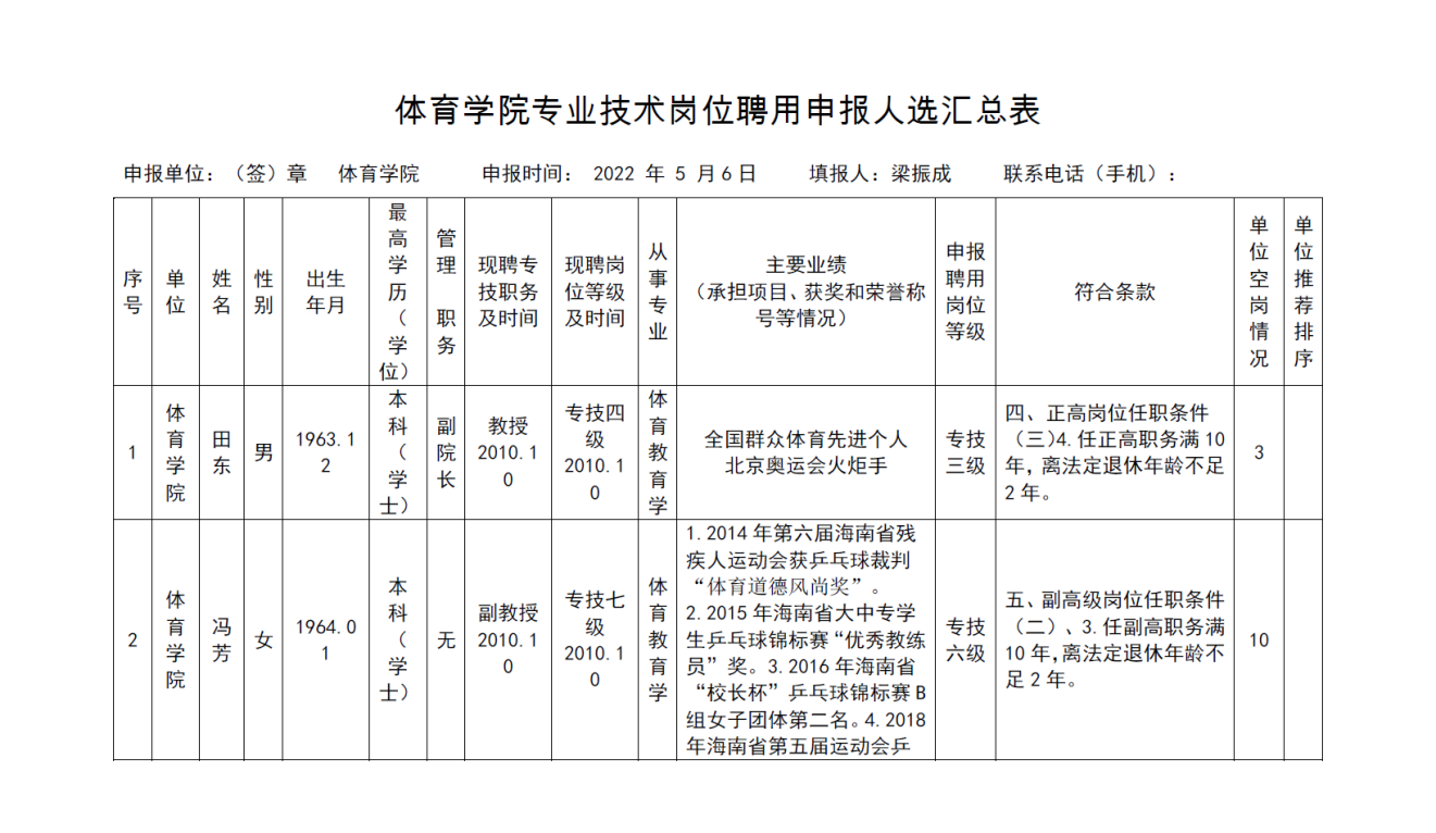 《 伟德专业技术岗位聘用申报人选汇总表》